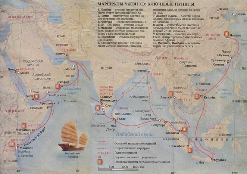 В XV веке, за десятилетия до начала Великих географических открытий Индийский океан бороздили эскадры китайских громадных кораблей во главе с адмиралом Чжэн Хэ. В течение почти 30 лет они совершили 7 экспедиций и доплыли до восточной Африки. Исследователи утверждают, что по размаху экспедиция не уступала Колумбу и китайцам было вполне по силам достичь Европы. Однако этого не произошло. В 1433 году экспедиция вернулась домой, а после этого не только не совершилось больше ни одного плавания, но и вообще в Китайской империи было запрещено строительство флота.