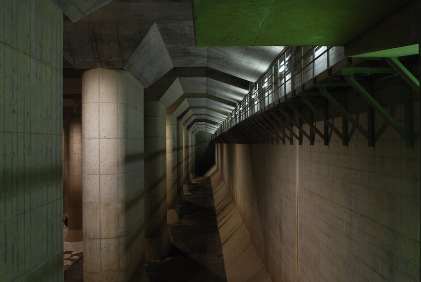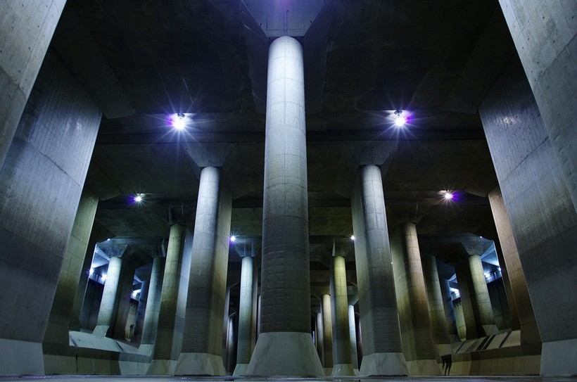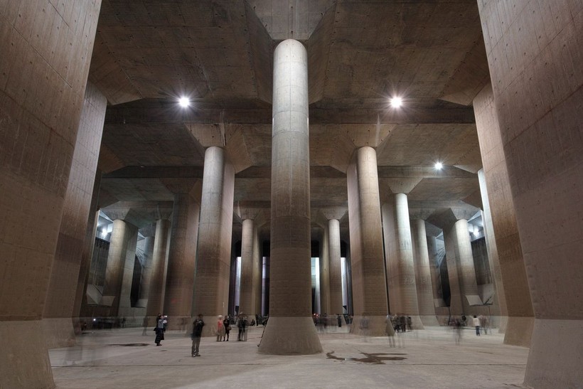 После продолжительных ливневых дождей, небольшие реки превращались в бурные и мутные потоки, которые быстро выходили из берегов и затапливали городские кварталы, расположенные в низине. Японские инженеры решили для отвода паводковых вод соорудить резервуар, наподобие тех, которые функционируют в городских системах ливневой канализации. Надо отметить, что в Японии довольно распространены подобные защитные системы, которые аккумулируют излишнюю воду на время разлива рек. Но чаще всего их сооружают в виде открытого котлована, что значительно удешевляет и упрощает процесс строительства. Но в случае с пригородом Токио, занятом плотной многоэтажной застройкой, такой вариант не подошел, ввиду отсутствия свободного места. Поэтому инженеры и приняли решение поместить накопительный резервуар под землю. Огромное подземное сооружение, строительство которого велось на протяжении 9 лет, было закончено в 2002 году.