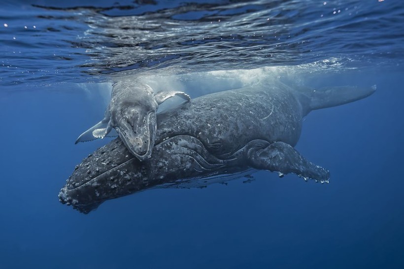 Малыш горбатого кита плавает со своей мамой