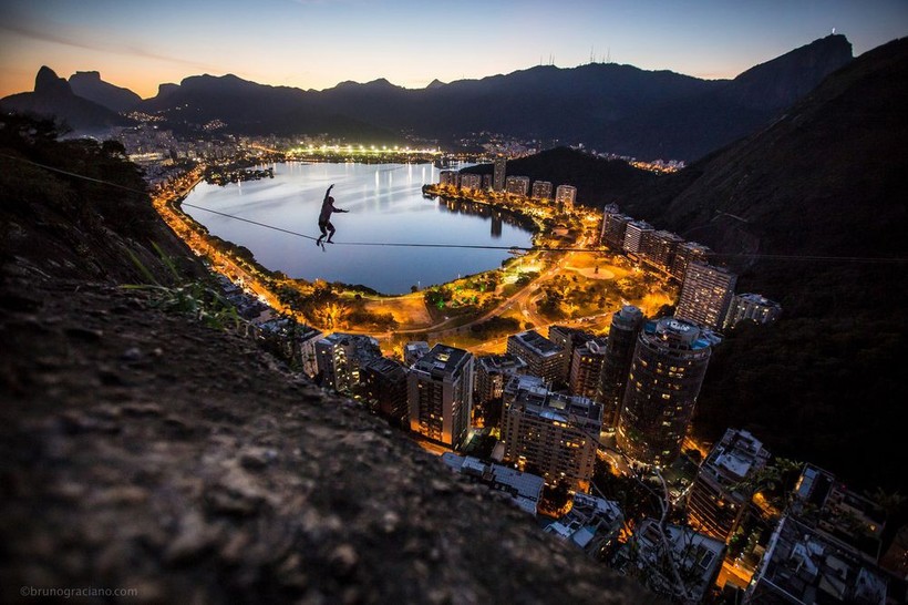 Неподражаемый Марсио Кардозо идет по канату, натянутому над Рио-де-Жанейро.