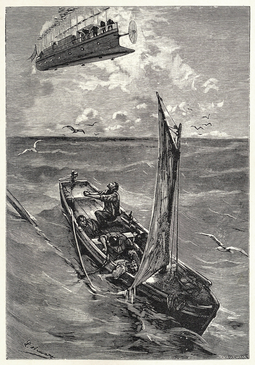 В данном рассказе писатель пророчески описывает большой летательный корабль, приводимый в движение вращающимися винтами. Над его созданием и трудится главный герой. Очевидно, что изобретение не что иное, как вертолет. Но в реальном мире первый рабочий аппарат такого плана был создан лишь спустя два десятка лет.