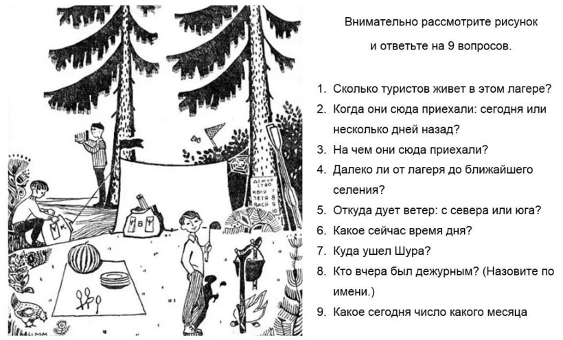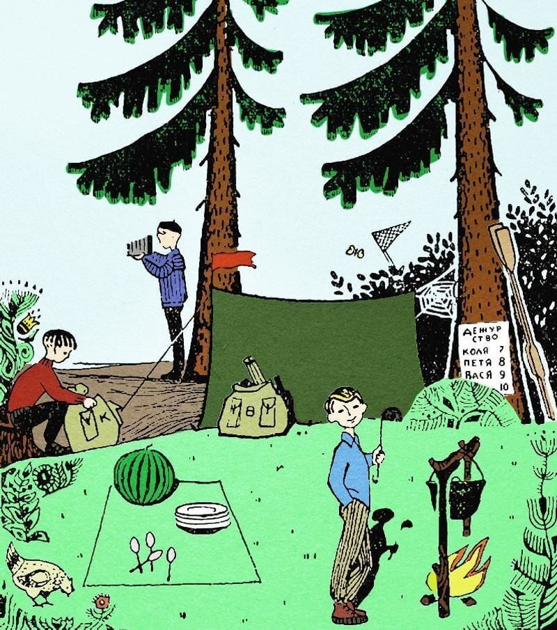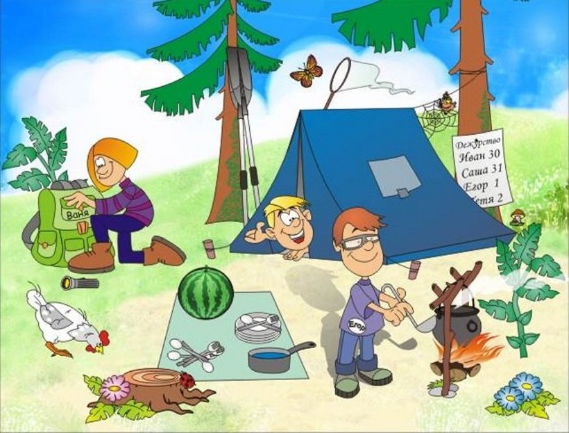 8. Попробуем разобраться, кто есть кто. Шура ловит бабочек, Коля роется в своем рюкзаке, на котором изображена буква его имени, Вася фотографирует — из его рюкзака виднеются приспособления для фотоаппарата, значит еду готовит Петя. А согласно списку, перед ним должен был дежурить Коля.