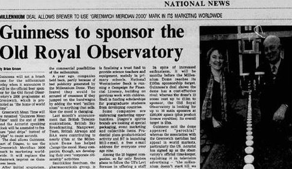 В 1998 году отличилась розыгрышем компания Guinness: ее представители рассказали, что стали спонсором Гринвичской обсерватории. Они заявили, что целый год планета будет жить в соответствии со временем по Гиннессу, а не по Гринвичу. Об этом, кстати, даже написали в некоторых солидных СМИ.