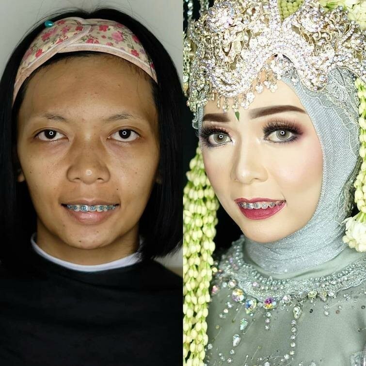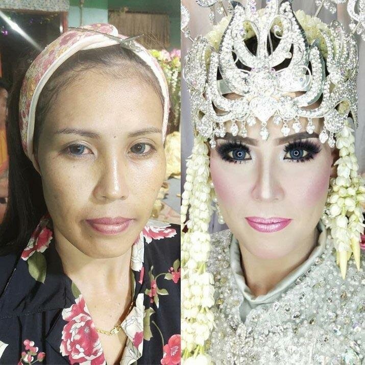 К свадьбам невесты невероятно преображаются. Особенно азиатские невесты. Во многих странах Азии (например, в Индонезии и Таиланде) у невест традиционно очень впечатляющий образ: платье из дорогих материалов, обувь, множество украшений. Но самое главное для них — это макияж. Он настолько яркий, что с таким мэйкапом порой даже близким людям сложно узнать девушку. Над лицом невесты визажисты трудятся по несколько часов, а девушки смиренно сидят в ожидании итогового образа. Порой меняется все: появляются не только накладные ресницы и широкие брови, меняется даже цвет кожи и глаз. Только посмотрите на эти поразительные фото до и после!