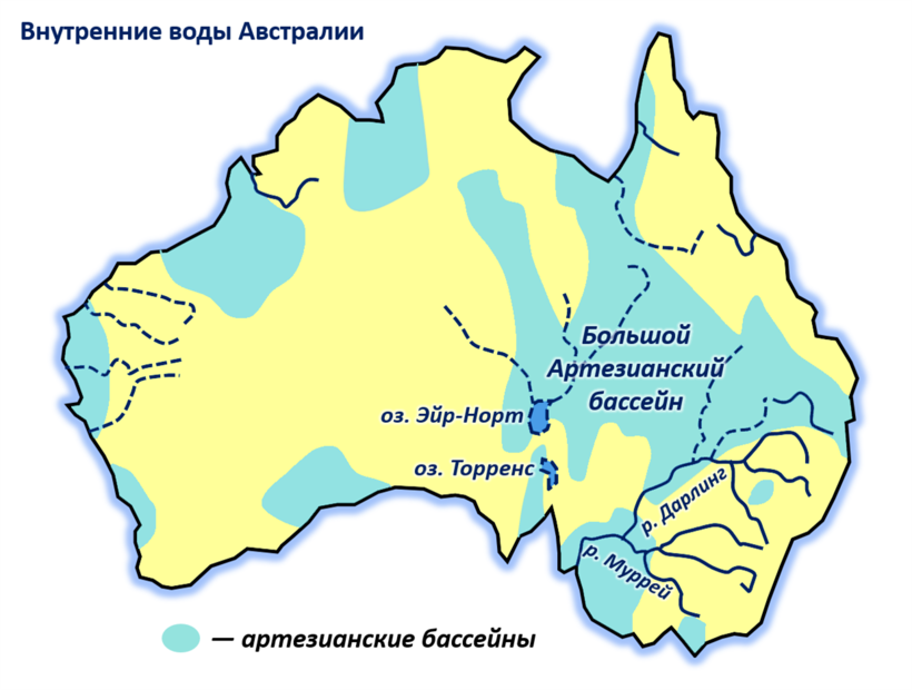 Большая часть Австралии представляет собой безводную пустыню. Реки здесь если и присутствуют, то только в виде временных водных потоков, которые существуют здесь весьма непродолжительное время и даже появляются не каждый год. И даже Муррей и Дарлинг, крупнейшие реки континента, могут на несколько месяцев превратиться в цепь неглубоких озер. Но вся эта безводная пустыня хранит под толщей песка невероятное сокровище — Большой Артезианский бассейн, во многом благодаря которому возможна жизнь людей во внутренних частях Австралии.