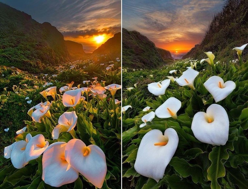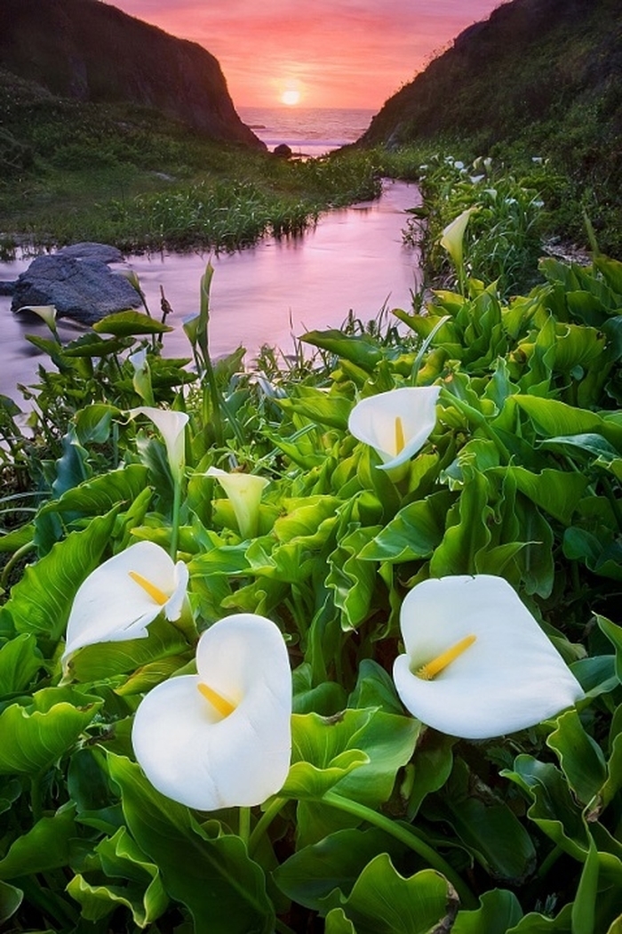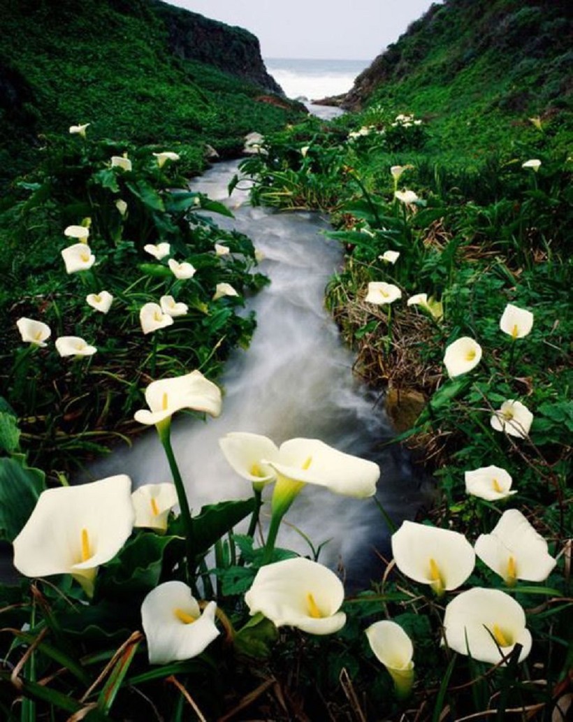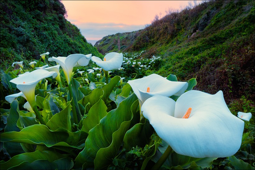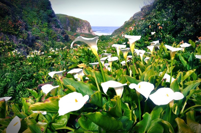 Наша планета настолько восхитительна, что райских мест у нее бессчетное количество. И одно из них находится в Калифорнии (США). Здесь, в малонаселенном местечке под названием Биг-Сур, находится Долина диких калл. И хотя эти цветы сами по себе отличаются красотой и изяществом, они также выбрали себе для жизни не менее живописную местность. Каждый год с приходом весны белоснежные «кувшины» расцветают в долине, окруженной скалами и выходящей прямо к побережью Тихого океана, тем самым превращая и без того завораживающее местечко в поистине райский уголок.