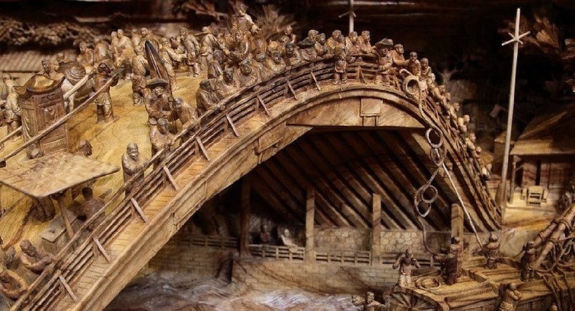 На создание этого шедевра длиной 12 метров у мастера ушло целых 4 года. В общей сложности композиция насчитывает 550 героев, а ведь сколько здесь еще деревьев, зданий и прочих объектов — просто не счесть. Каждая деталь вырезана с такой кропотливой четкостью, что у людей можно разглядеть лица, на деревьях — листья, а на крышах домов — черепицу.