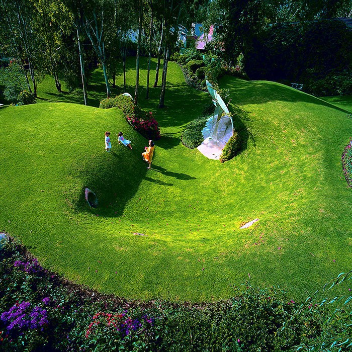 Прогулка по саду буквально означает здесь отдых на крыше дома, ведь вся конструкция покрыта сочной зеленью. Внутреннее же пространство вдохновлено формой арахисовой скорлупы.