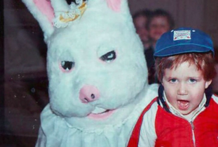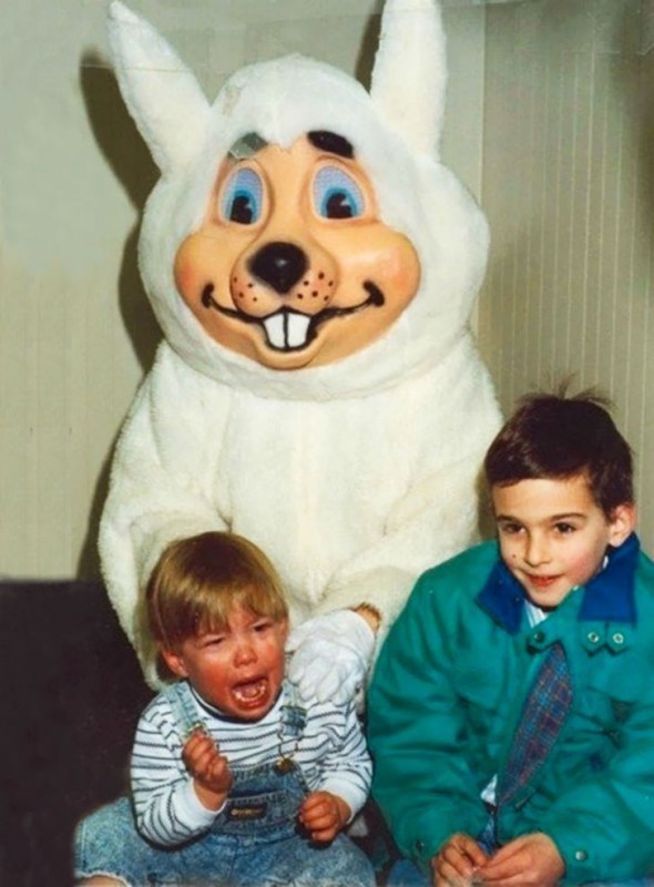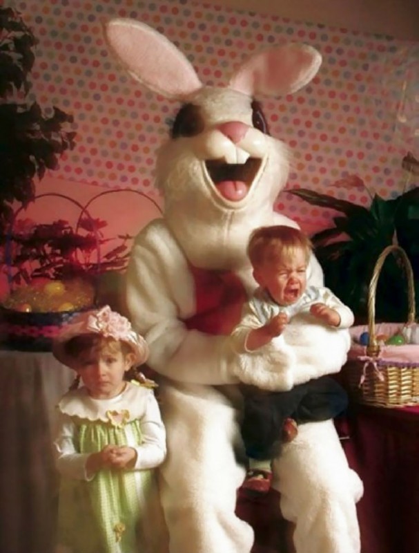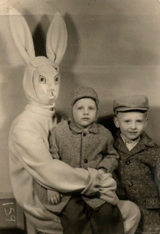 Во многих европейских странах, а также в Канаде и США, одним из главных символов Пасхи всегда был кролик. Этот персонаж для детей был настолько же важен, как и главный рождественский волшебник Санта. Впервые история о зайчике упоминается в немецких рукописях XVI века. Именно немцы перевезли эту историю в Северную Америку, где она тоже закрепилась. Пасхального зайца считали одним из самых больших радостей детства, и, кажется, как можно испортить это милое создание? А очень просто: неудачным костюмом… Только посмотрите, каких зайчиков видели малыши прошлого. Уж что-что, а радостнее от этих снимков не становится. И даже на лицах детей отражен весь ужас сей встречи.