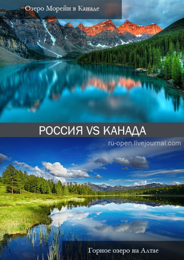Ни для кого не секрет, что Канада — одна из самых богатых стран по численности озер невероятной красоты. Их очень много, сами канадцы насчитывают более 30 000. У нас, конечно, цифры далеко не такие, но по красоте мы не уступаем. Например Кучерлинское и Телецкое озера на Алтае, Онежское и Ладожское в Карелии, Верхневолжские озера, ну и, конечно же, Байкал.