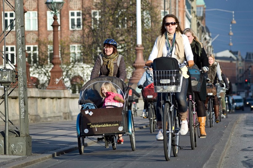 В Копенгагене с невероятным вниманием относятся к велосипедистам и их комфортному пребыванию на дорогах, всячески стимулируя датчан сменить автомобиль на велосипед. Специально для них по всему городу проложена целая сеть велосипедных дорожек и велопарковок, качественных и широких, позволяющих без проблем добраться почти в любую часть города. Общая протяженность велосипедных полос для движения в Копенгагене составляет около 400 километров. Кроме того, в метро существую специальные вагоны для пассажиров с велосипедами. А в центральной части города достаточно много улиц, куда запрещено заезжать на автомобиле, все по тем же причинам пробок, выхлопов, тесноты и отсутствия мест для парковок, но вот для велосипедистов здесь проложены дорожки и сделаны парковки. По всему городу работает сеть прокатных и сервисных центров, обслуживающих владельцев двухколесных средств передвижения. Согласно статистике, около 50% жителей датской столицы используют велосипед в качестве транспорта, позволяющего добраться до работы. Кроме традиционных велосипедов, здесь широко распространены семейные грузовые велосипеды, велосипеды с колясками, велосипеды с тележками для сотрудников доставки еды, и даже полицейские в Копенгагене ездят на велосипедах.