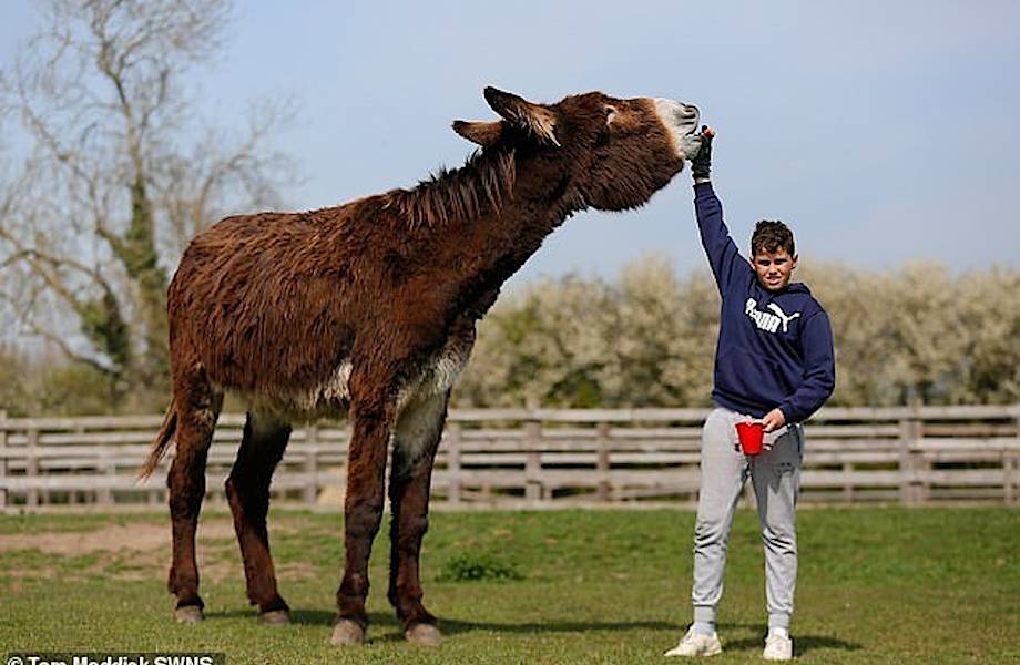 Дом Деррика в Великобритании, в ослином заповеднике Линкольншир. Этому гиганту сейчас пять лет. Ослик еще молодой, но он уже давно обогнал своих соседей: рост ишака — почти 171 сантиметр. И, кажется, скоро он перегонит и мирового рекордсмена: еще один осел этого вида по кличке Ромулус живет в Техасе, и он 173 сантиметра, тоже настоящий великан.