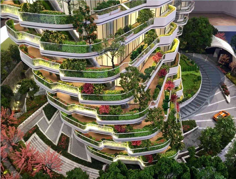 Одним из ключевых моментов в проекте Винсента Каллебо выступает вертикальное озеленение, которое так полюбилось архитекторам со всего мира. Тропический климат Тайваня позволяет использовать для озеленения террас максимальное разнообразие растений, поэтому здесь удалось создать особое экологическое пространство, городской симбиоз человека и природы.