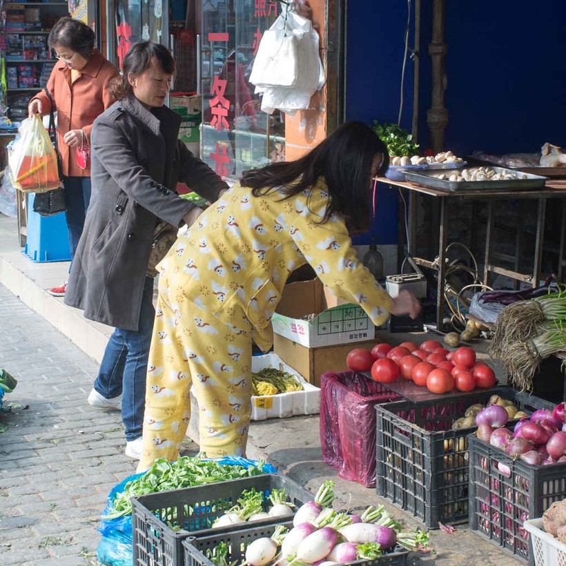 Удобные, бесформенные пижамы стали новым модным трендом для жителей Шанхая, отправляющихся позавтракать в ближайшее заведение или выгуливающих утром собаку в парке.