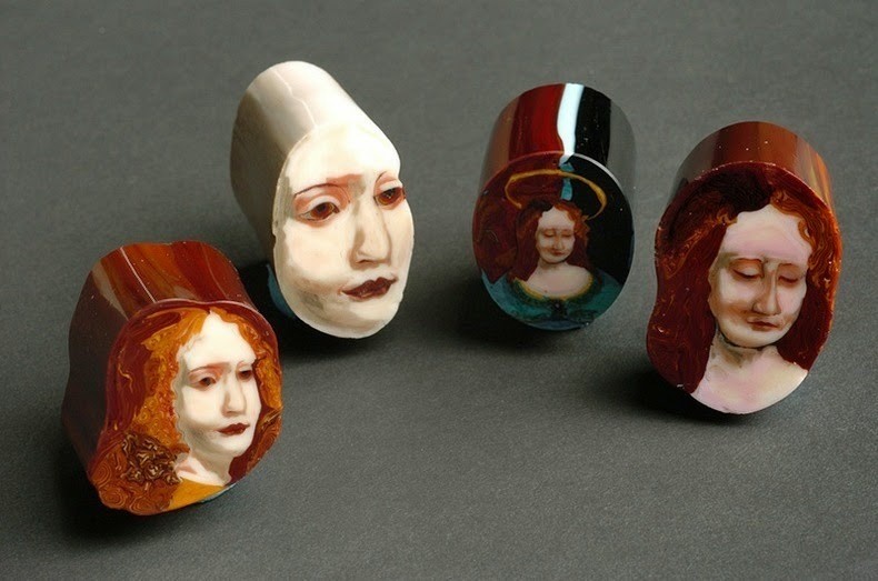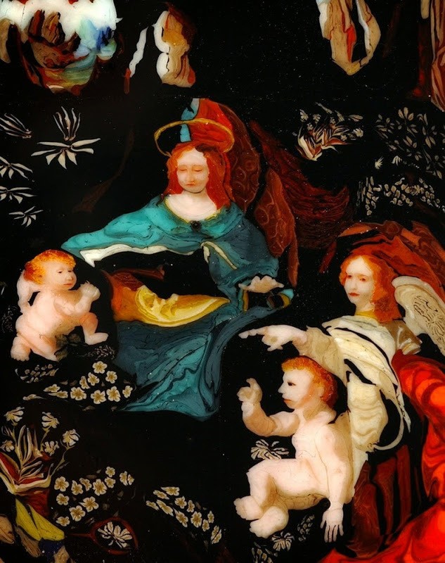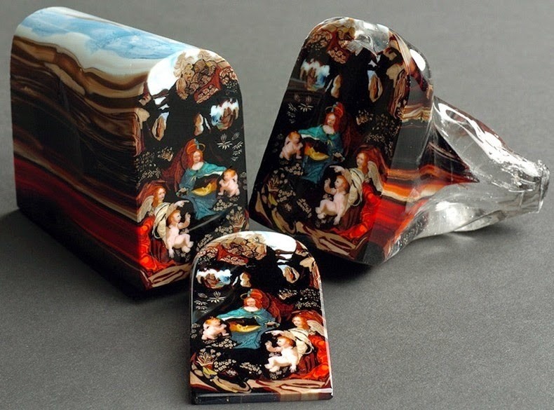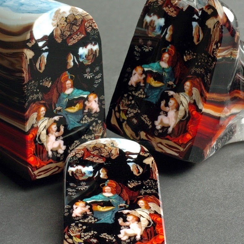 Позже, когда получившийся брусок остывает, его нарезают поперек, словно буханку хлеба. В итоге получаются стеклянные узоры, совершенно идентичные, но разной толщины. Когда-то эту технику использовали при изготовлении картин из стекла, декоративных ваз и прочих сосудов. Чаще всего узор незамысловатый: это может быть простой цветок или вообще неровный круг. Но у Лорена Стампа картины особенные, и уровню его мастерства смогли бы позавидовать даже лучше стеклодувы Ближнего Востока и Венеции: Лорен создает портреты и картины, в которых есть сюжет. Удивительно, насколько искусны его работы, и только представьте, сколько слоев стекла, сколько оттенков нужно наложить, чтобы получился такой восхитительный результат! Его шедевры высоко ценятся, и один ломтик стоит более 5 тысяч долларов.