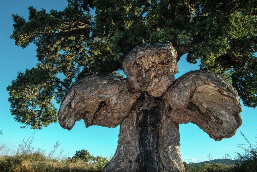 Еще одно необычное дерево — корсиканский пробковый дуб. Оно приняло такой вид после пожара. У дерева выжженная основа. Оно напоминает хищную птицу, раскинувшую крылья. Люди, побывавшие у этого дерева, утверждают, что как только попадаешь под его крыло, возникает ощущение уверенности и защиты.