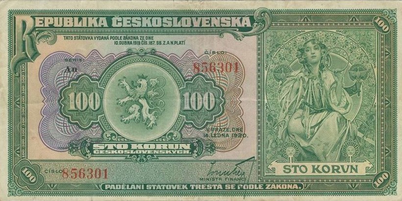 Когда страна получила независимость после Первой мировой войны художник был призван разработать важную часть идентичности любой страны — деньги. Он создавал имидж новой независимой Чехословакии. Он создал неповторимый стиль, который воплощал традиции страны. Его банкноты были сделаны в манере ар-нуво. Примечательно, что художник использовал свои фирменные изящные узоры, это явилось прекрасным средством защиты от подделок. Такого не было на денежных знаках других стран.