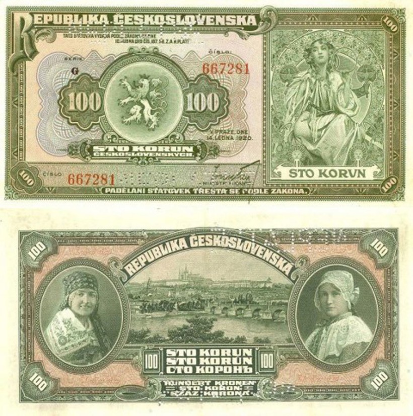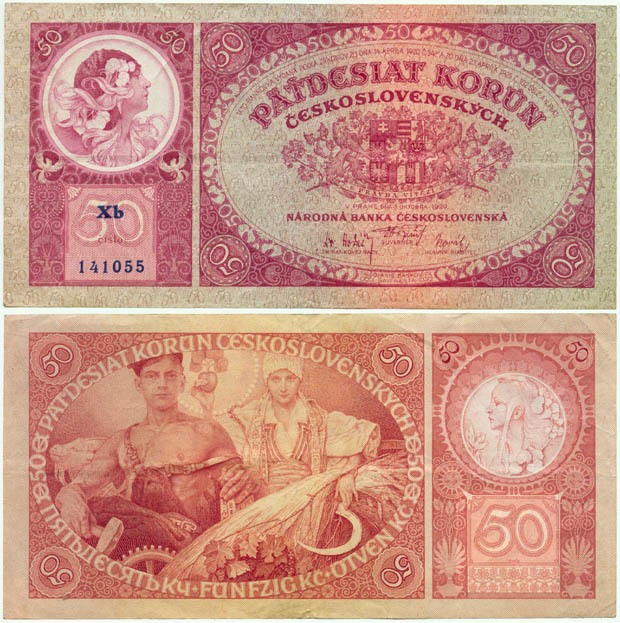 В 1923 году на 50-кроновой купюре он изобразил масонские знаки молоточек, солнце). И это неслучайно. Когда Альфонс Муха был в Париже, он стал масоном, на его деньгах масонская символика возникла раньше, чем у всех. За несколько лет до американского доллара и за 83 года до украинской гривны (500 гривен).