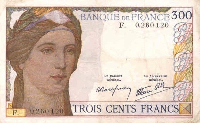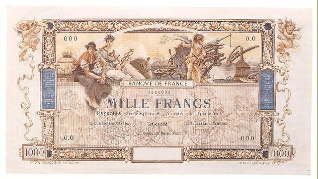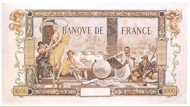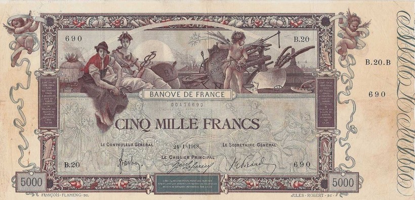 Очень красивые французские деньги. Перечень творцов, рисовавших их, насчитывает более двух с половиной десятков имен. Первый из них — Франсуа Фламенг (1856–1923). Он расписывал Сорбонну и театр «Опера-Комик». Франсуа был известен как портретист и батальный живописец. Его работы многие считают реалистичным свидетельством Первой мировой войны.