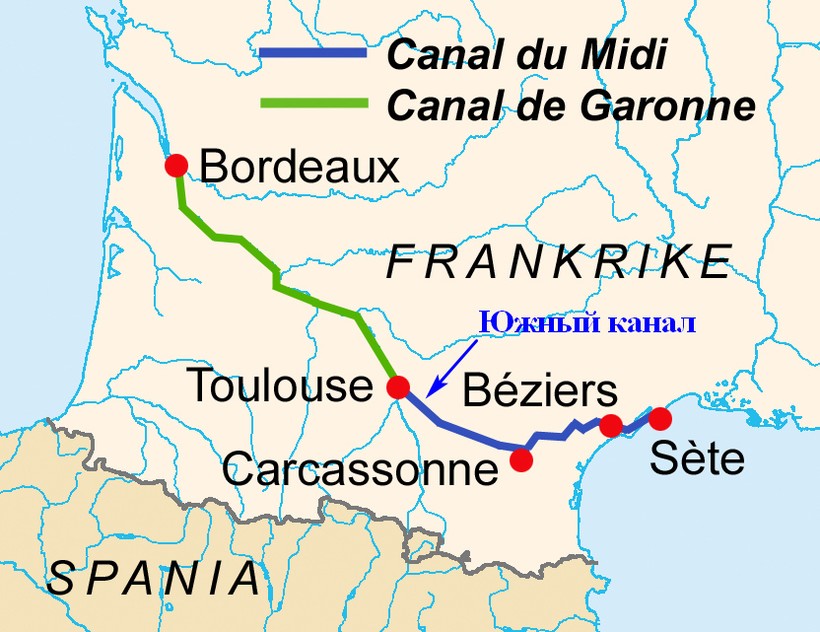 Южный или Лангедокский канал имеет протяженность 240 километров и начинается в городе Тулуза. Канал пролегает по живописным районам южной Франции с полями, виноградниками и уютными провинциальными городками, а заканчивается в городе Сет на берегу Средиземного моря. Ну а если вы хотите попасть в Атлантику, вам придется воспользоваться Гароннским каналом, начинающимся в Тулузе и заканчивающимся рекой Гаронной, впадающей как раз в Бискайский залив.