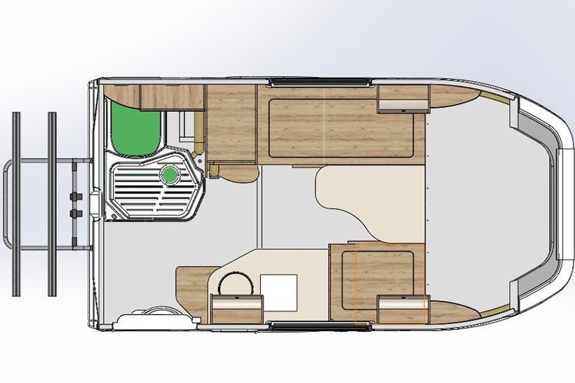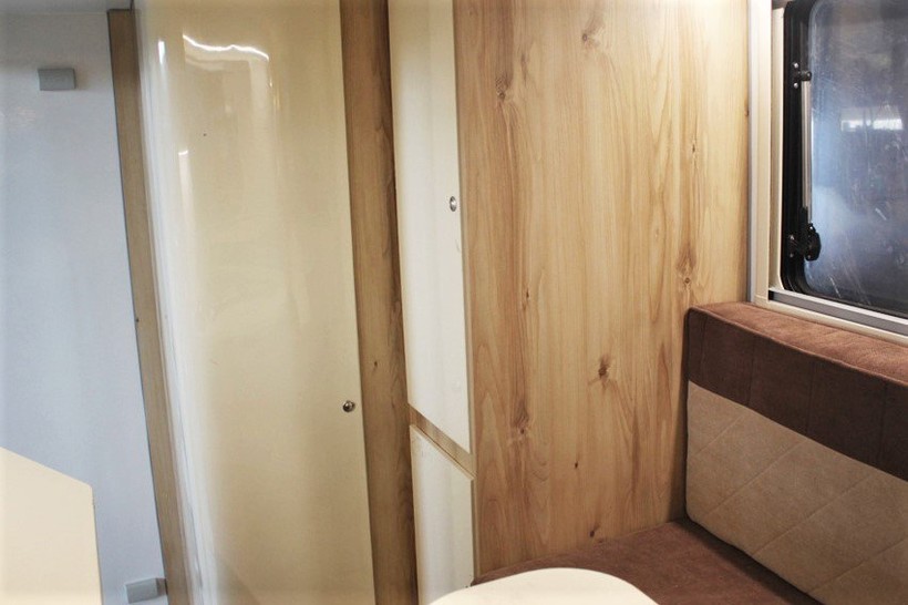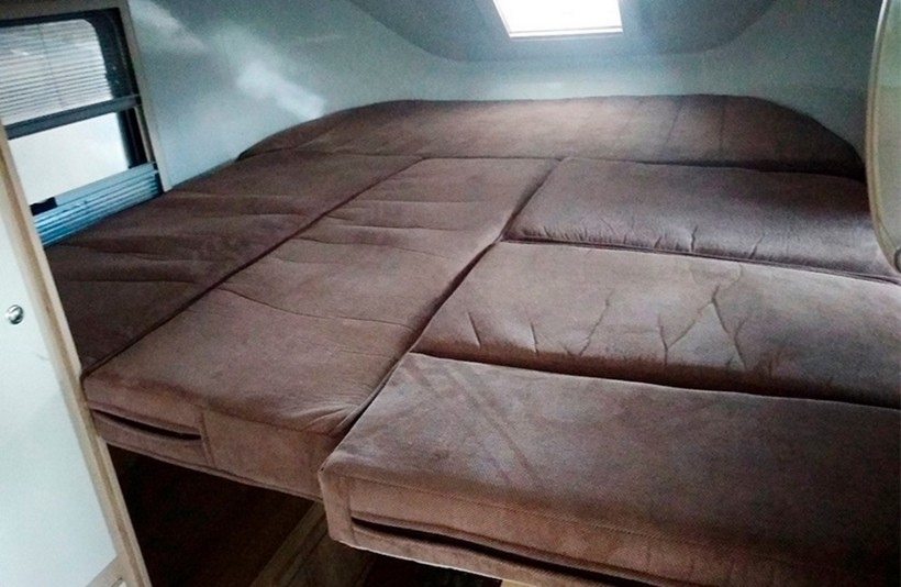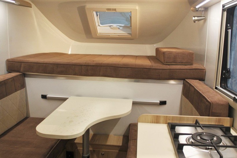 Внутри российского автодома вполне комфортно могут разместиться два человека: есть просторное спальное место, небольшая кухонька с раковиной, и даже нашлось место для душа и биотуалета. Также внутри машины можно готовить: здесь имеется газовая плита с одной конфоркой, к которой подключен пятикилограммовый баллон. В автомобиль подведена горячая и холодная вода: бак на 70 литров с системой нагрева установлен в корпусе дома. Машина получилась небольшая и вполне подойдет для путешествий на близкие расстояния.