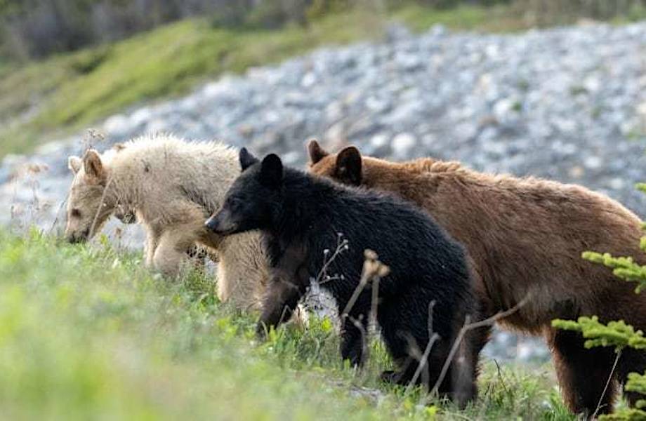В Канаде обнаружили уникальную семью медведей: все ее члены разного цвета. Животных уже успели запечатлеть местные фотографы дикой природы. Мама-медведица привычного бурого цвета, и у нее два малыша: один из них черный, а другой — редкого белого окраса.