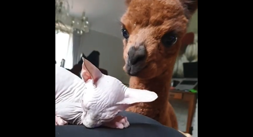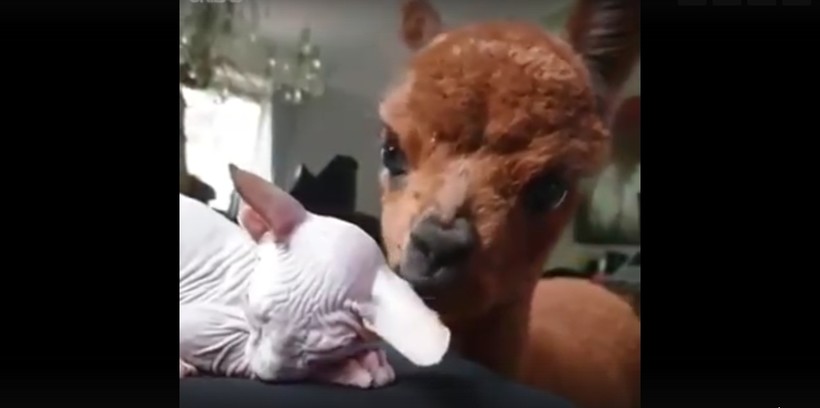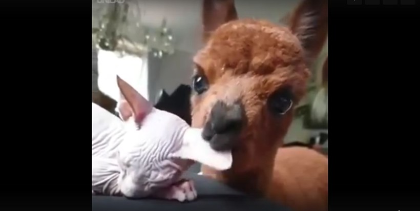 В этом видео запечатлен забавный момент: альпака подошла к сфинксу — кошке без шерсти. Наверное, это животное и привлекло маленькую альпаку именно тем, что на его теле совсем ничего не растет. Альпака решила проверить, так ли это, и стала кусать кота за ухо. Но кот попался очень терпеливый и медитативный — он и глазом не повел, когда альпака стала его грызть.