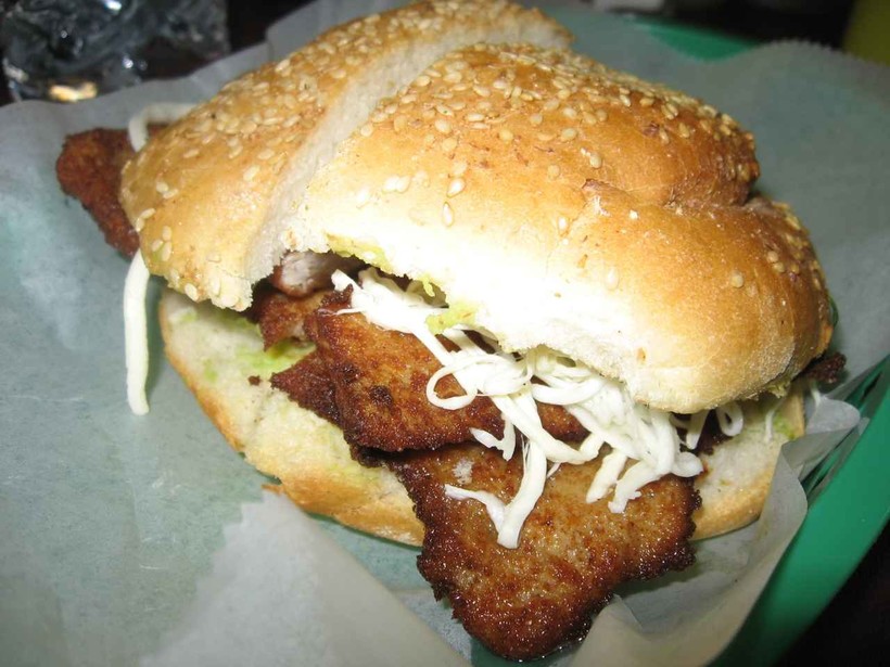 Что внутри: фактически это обычный багет, а внутри — гибрид вьетнамской и французской кухни. Помимо мяса (чаще всего свинины или печеночного паштета) туда добавляют французскую миндальную пасту, майонез, кориандр, маринованную морковь, ломтики соленых огурцов, а также поджаренный сыр тофу.