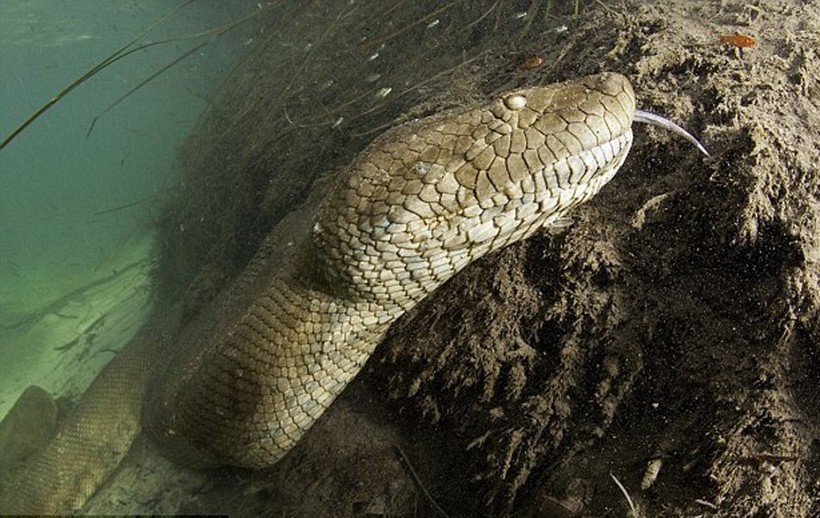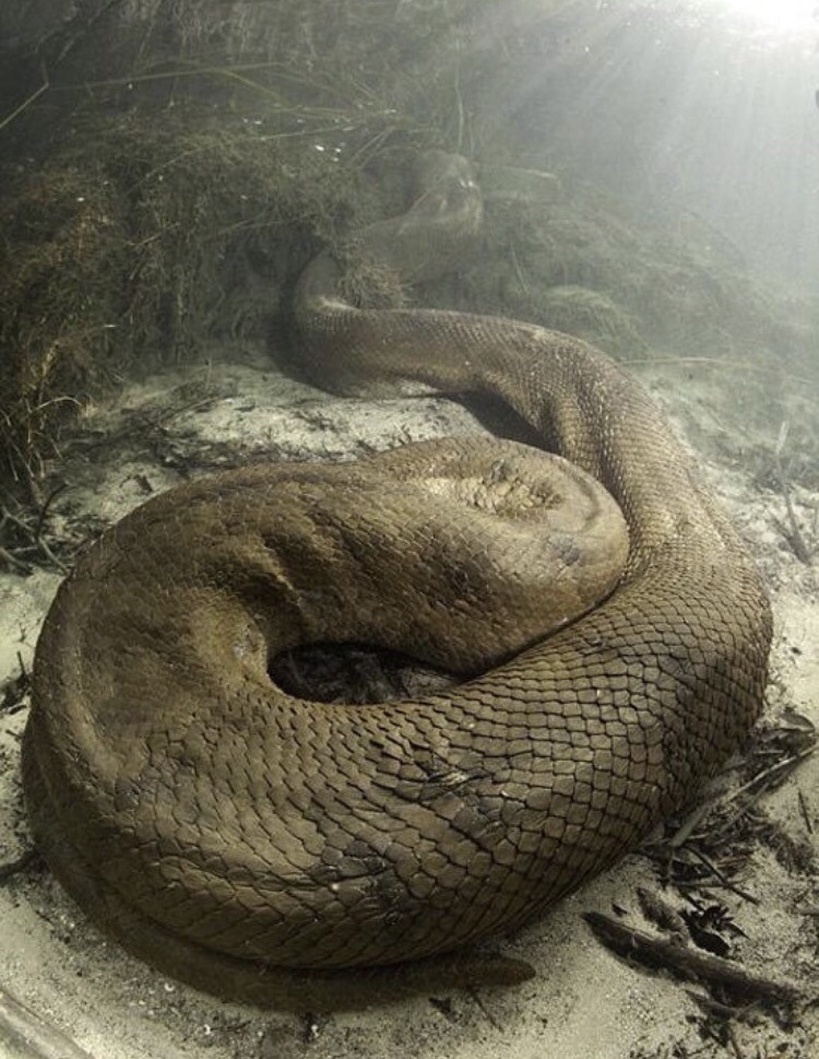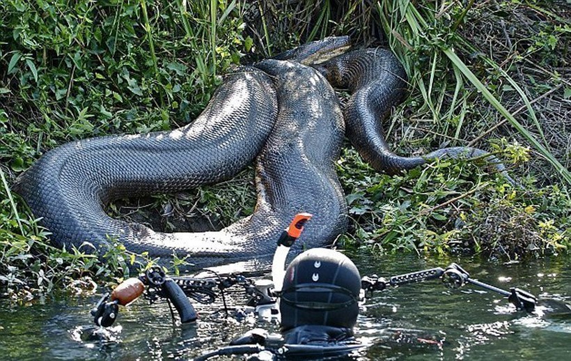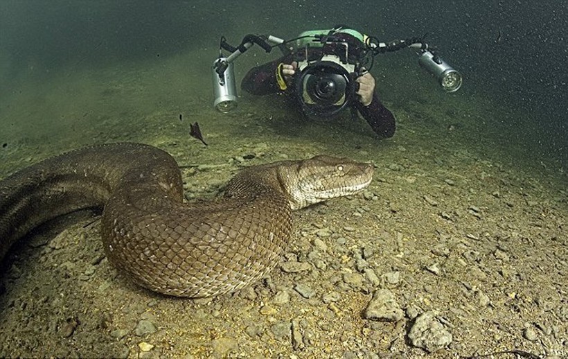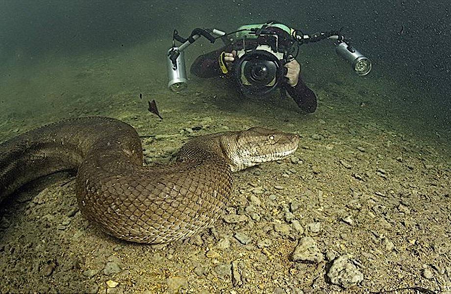 Как мы знаем, анаконда — это самая большая змея на земле, а рекордсменом на данный момент считается особь длиной 11 метров. Как и все прочие змеи, анаконда заглатывает свою добычу целиком, а питается она самыми разными млекопитающими, рептилиями или птицами. Оказаться рядом с этим опасным хищником не захочет никто. Правда, один безумец все же нашелся. Смельчаком оказался шведский фотограф Франко Банфи, который намеренно нырнул в воды Амазонки, чтобы с самого близкого расстояния сфотографировать 8-метрового гиганта!