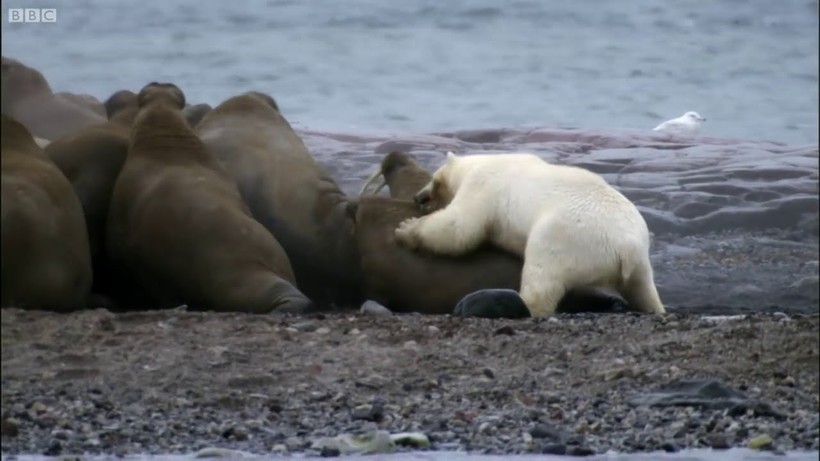 Медведь является главным врагом моржа, но далеко не на всех моржей можно напасть. Взрослый и заматеревший морж и сам может быть опасным соперником белому медведю. Его шкуру будет очень трудно прокусить, а клыки могут нанести медведю тяжелые раны, поэтому белый хищник часто нападает на самых слабых особей. В этом случае легкая паника началась в стаде моржей, и все они двинулись к морю, так как там они чувствуют себя в безопасности.