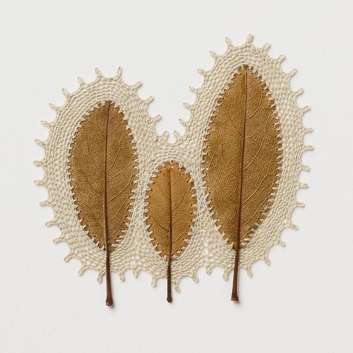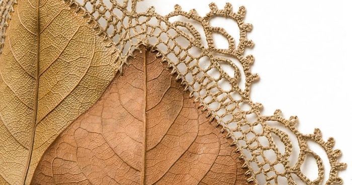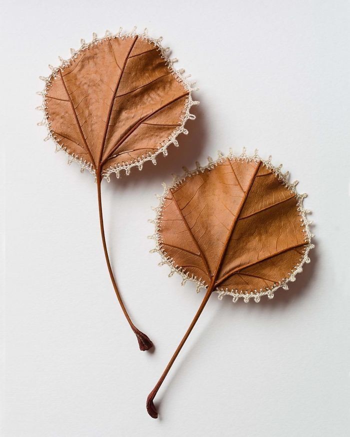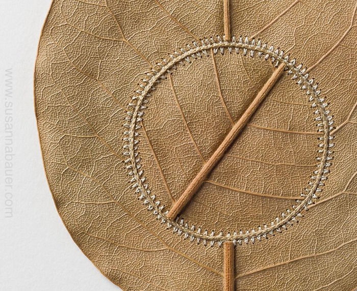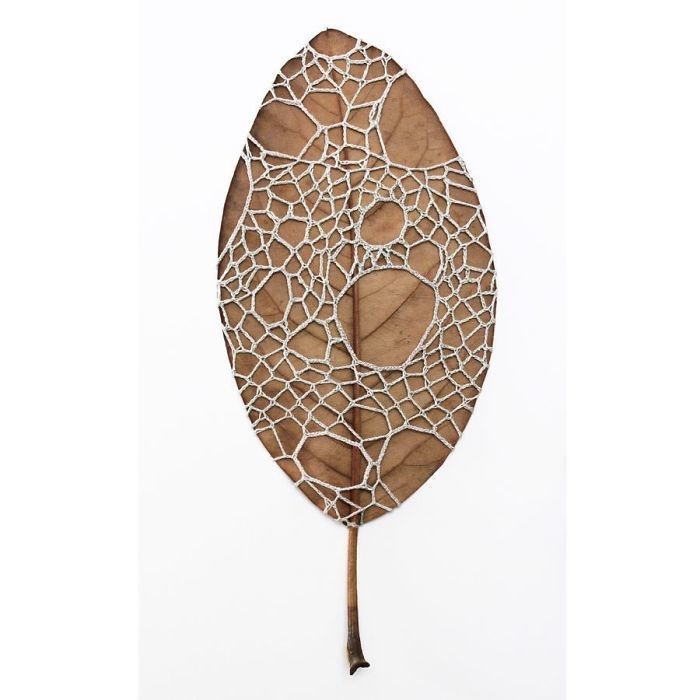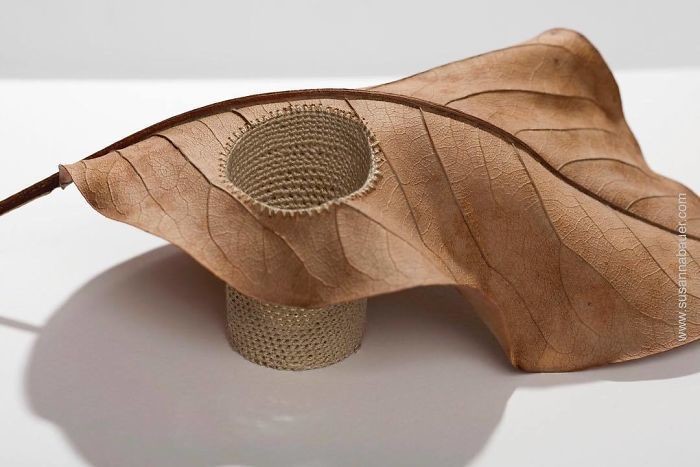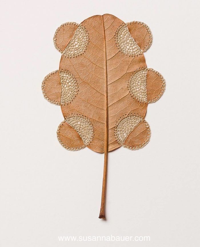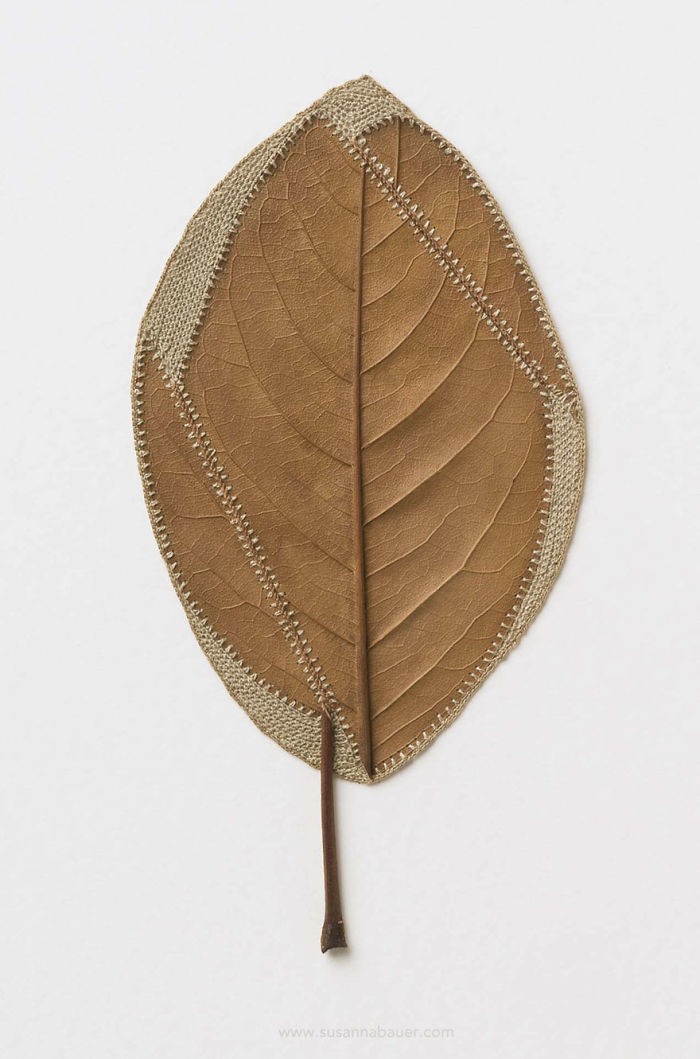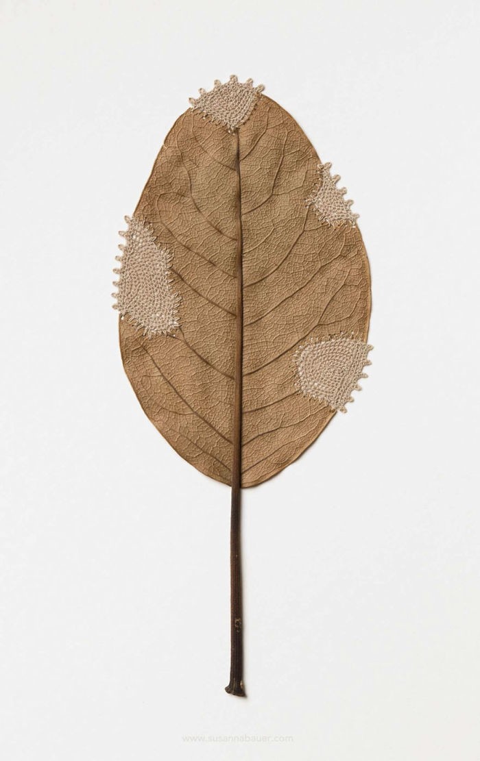 Художница дополняет хрупкие сухие листья орнаментами, связанными крючком из обычных ниток. Несмотря на то, что вязание крючком всегда считалось незатейливым ремеслом, Сюзанне Бауэр удалось возвести его в ранг искусства. При этом художница ничем не обрабатываем и не покрывает готовые произведения, поэтому они остаются невероятно уязвимыми, что лишь добавляет ценности этим творениям.