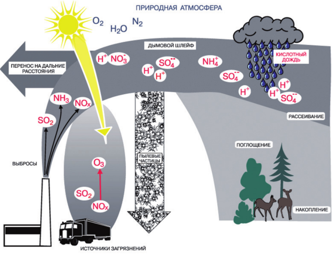 Для начала стоит разобраться, что же такое кислотные осадки и как они образуются. Увы, это не преувеличенная опасность, растиражированная СМИ ради привлечения внимания, а реальная проблема практически всех современных стран мира. Нормальный показатель кислотности осадков равен 5,6-5,7, в то время как кислотные дожди и туманы имеют уровень pH 2,5-5. Все дело в серной (H2SO4) и азотной (HNO3) кислотах, которые содержатся в составе таких осадков. Кислоты в свою очередь образуются в результате химической реакции оксидов серы и оксидов азота с водой. Названные выше оксиды — это обязательная составляющая любого атмосферного воздуха в крупных городах, так как они являются компонентами выбросов промышленных предприятий и автомобильного транспорта.