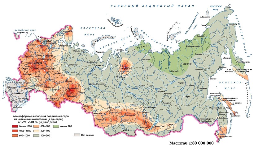 Чаще всего кислотные дожди наблюдаются после длительного периода жаркой и сухой погоды. То есть типичные летние грозы и ливни, которые приходят на смену палящему солнцу и длительному периоду ясной погоды, как раз и содержат высокое количество агрессивных кислот. Чем же опасны эти дожди, и неужели незначительная разница в уровне pH имеет такое значение? К сожалению, да. Единичный случай, конечно, не способен кардинальным образом изменить экологическую обстановку, но регулярное выпадение и накопительный эффект дают о себе знать. В первую очередь страдает растительность и водные объекты. Обогащение водоемов кислотами ведет к изменению физико-химических параметров воды, сказывается на ухудшении ее качества и пригодности для обитания водной флоры и фауны. Любая растительность, в том числе леса и посевы сельскохозяйственных культур, также страдают от контакта с насыщенными кислотой осадками, что приводит к деградации естественных насаждений и потере урожайности. Кроме того, от токсичных осадков страдает и сама городская среда. Разрушение памятников архитектуры, коррозия элементов современных зданий, повреждения автомобилей — вот лишь неполный перечень проблем, вызванный ими. Но, конечно, итоговый негативный эффект от таких осадков — это ухудшение здоровья людей. Ну а на приведенной ниже карте можно наблюдать, в каких регионах России чаще всего выпадают осадки с повышенным содержанием серы, в том числе и серной кислоты.
