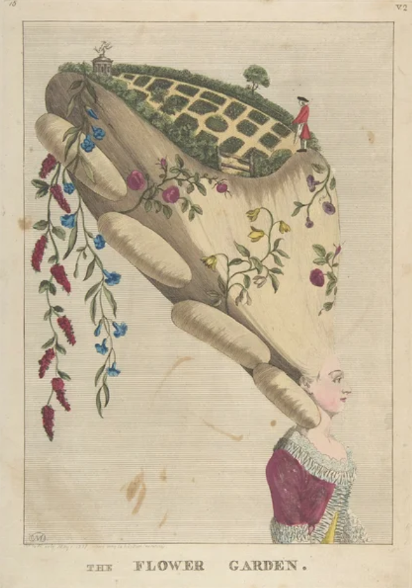 Эпоха 18 века в нашем представлении — это время высоких женских причесок. Да еще и с невероятными по нынешним временам украшениями. Представьте себе на голове английский сад с травой и лугами, или журчащие ручьи с ветряными мельницами, или английскую флотилию.