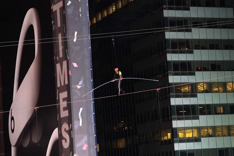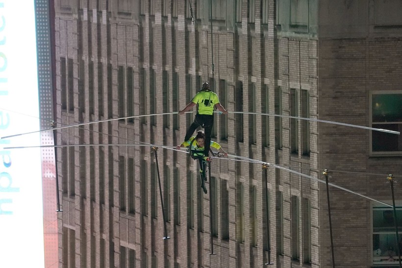 В прошлое воскресенье толпа зевак, среди которых были как уставшие жители Нью-Йорка, так и туристы, подняли голову в ночное небо, чтобы увидеть опасное шоу: над Манхэттеном гуляли канатоходцы.