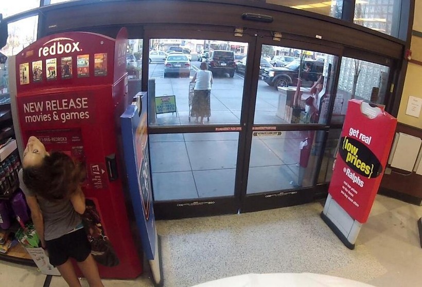 Камера видеонаблюдения запечатлела девушку у автомата, в которую будто кто-то вселился.