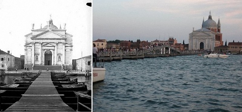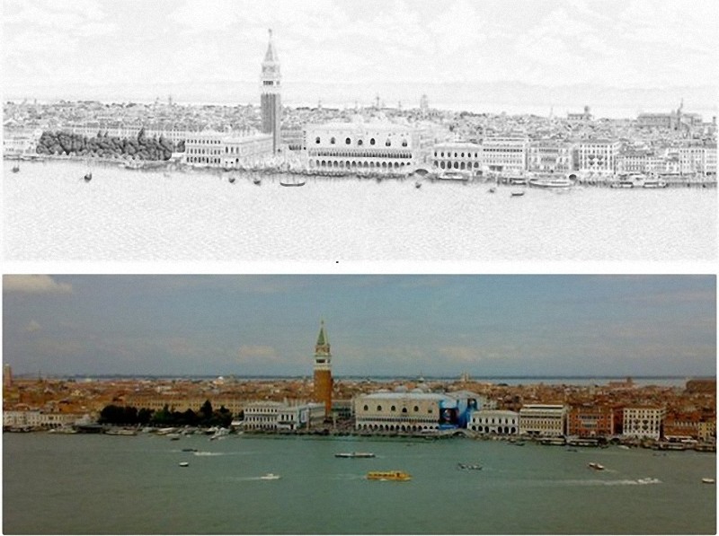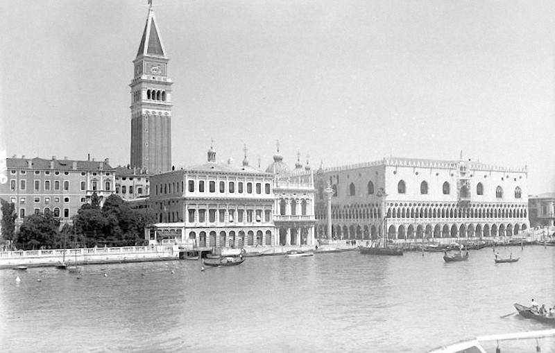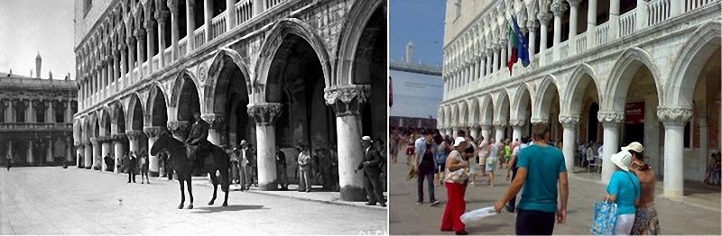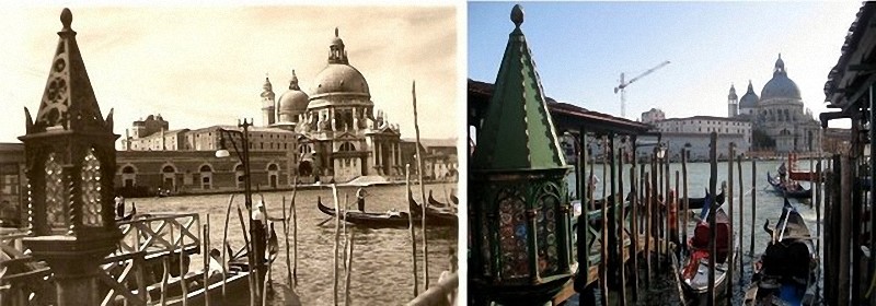 А это вид с колокольни о. Сан-Джорджо Маджоре на площадь Сан-Марко, добавились только водные такси, да рекламные растяжки реставрационных работ на Дворце Дожей. Если бы я владела технологией «состаривания» фотографий, то, наверное, больших отличий от оригинала в конце концов не нашлось бы!