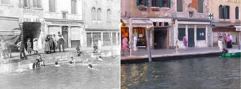 О! Поиски этого места стали для нас приятным приключением. Внимательно разглядывая открытку, пришла к выводу, что такое место на канале может быть только в районе Каннареджо. Увеличила текст и смогла прочитать надпись «Farmacia alle due Sereni». Ура! Google подтвердил, что это действительно район Каннареджо и даже показал расположение аптеки, только вот… вода рядом не просматривалась, а ведь на открытке четко видно, что дети купаются.