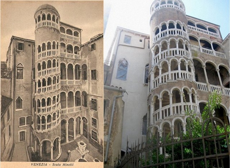 Ажурная винтовая лестница дворца Пьетро Контарини. Фотографировали, конечно же, снизу, а в оригинале с 3-4 этажа противоположного дома. Почему-то венецианцы не очень любят это место, слышала разные версии, одна из них гласит о том, что хозяин дома частенько заставал любовников своей любвеобильной супруги и сражался с ними прямо на леснице, даже кровь проливалась.