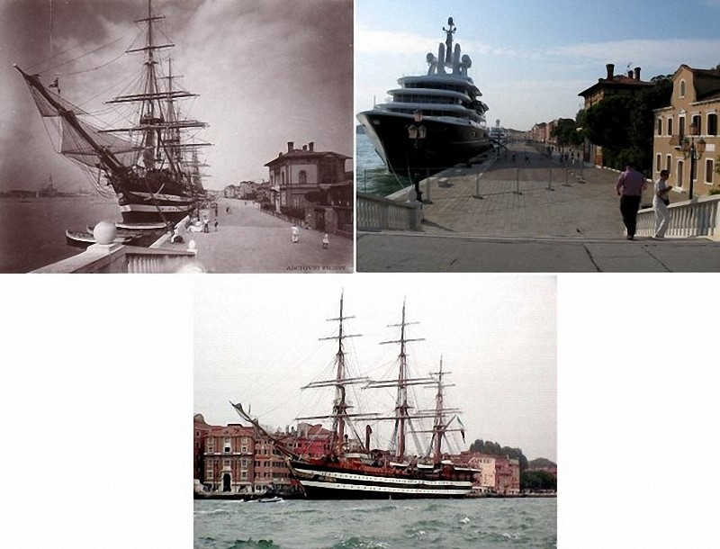 Фото с яхтой я сделала год назад, впечатлили ее размеры (уж не Абрамовича ли?). Поэтому, увидев открытку, мы сразу узнали место. Более того, три года назад в Венецию заходил парусник «Америго Веспуччи», правда, «припарковался» он в другом месте. Вот мне интересно теперь — тот ли самый это парусник, что на старинной открытке или его «ремейк»?