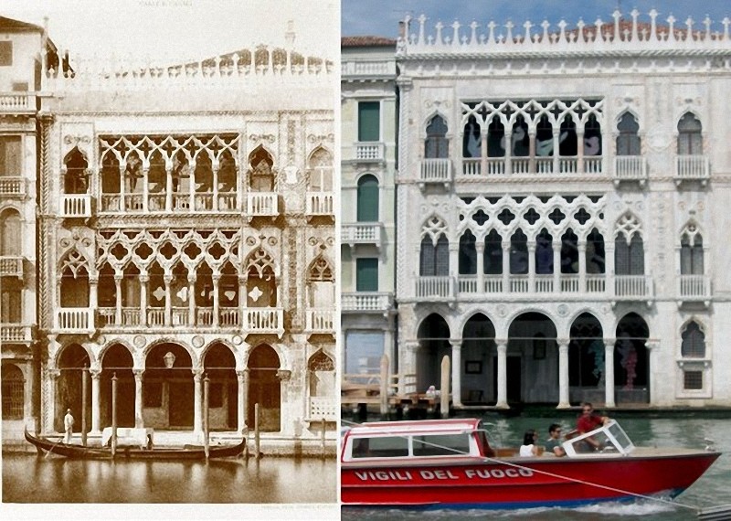 Когда-то он был облицован резными мраморными плитами, покрытыми позолотой, и под лучами солнца сверкал и пламенел. Не зря этот стиль в архитектуре получил название «пламенеющая готика». В конце 19 века владелец провел реконструкцию дворца, для чего плиты были сняты со стен. Мраморные плиты-то вернулись обратно на стены, а вот позолота исчезла вместе с реставратором…