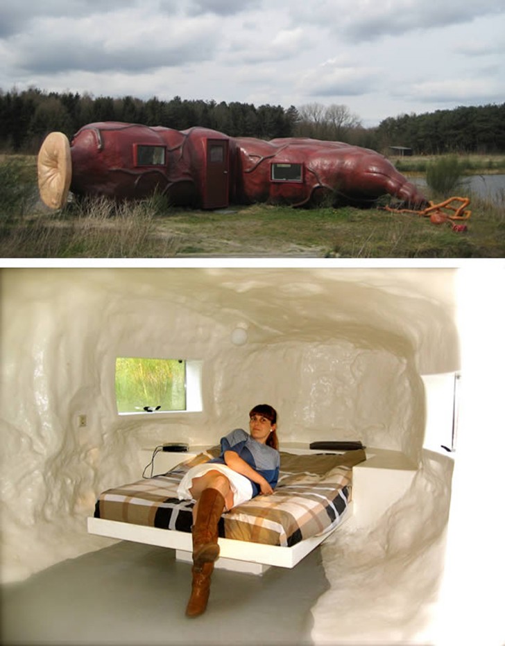 А как вам идея провести ночь в… кишечнике? Недалеко от города Антверпен прямо рядом с озером, где плавают черные лебеди, стоит странное сооружение: отель CasAnus, который точно списан с прямой кишки. Здесь всего один единственный номер, в котором есть все необходимое для проживания. Хотя, конечно, если вы рискнете туда зайти: гостиница выглядит уж очень натуралистично, словно гигантская кишка красно-коричневого цвета со сфинктером и выпирающими венами.
