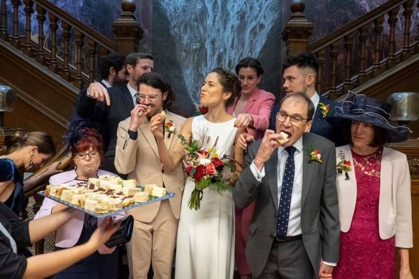На этом фото, например, Ян решил сделать групповой портрет, но не традиционный с натянутыми улыбками, а такой, какой он есть на самом деле. Невеста, жених и их близкие очень долго ничего не ели, и когда мимо прошел официант с закусками, они не стали упускать возможность хоть немного подкрепиться.