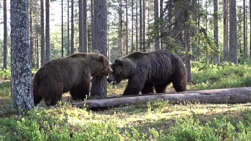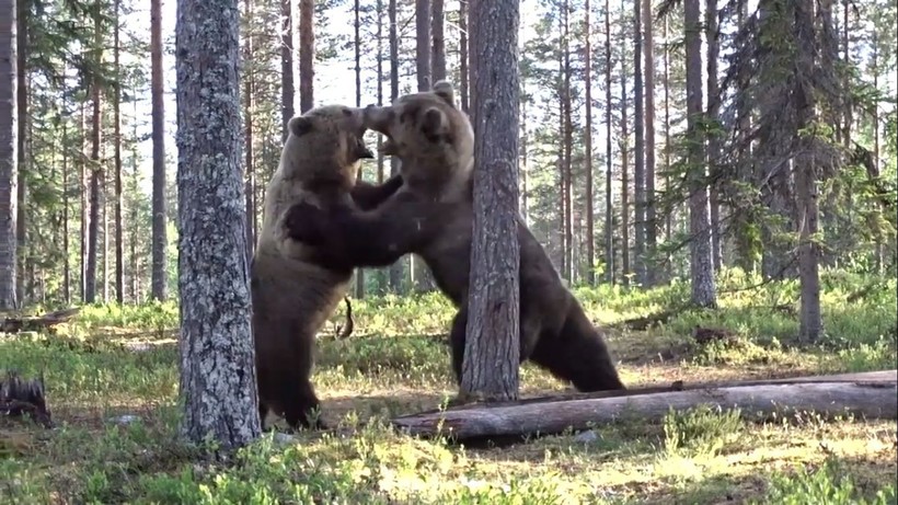 Автор этого видео смог снять медвежью драку в лесу неподалеку от финского городка Кухмо. Этот город расположен всего в семидесяти километрах от финско-российской границы. Молодой человек не испугался подойти близко к разъяренным медведям, которые, возможно, делили территорию в лесу и боролись за возможностью быть главным самцом. И видео получилось впечатляющее.