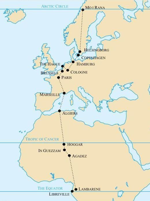 Стартовала экспедиция 22 февраля 1959 года. В каждом европейском городе грузовик встречали с огромными почестями. Пунктом назначения была обозначена столица Габона Либревиль. В Осло к льдине добавилось 300 килограммов медикаментов, которые отправились в одну из больниц Габона. И на пути экспедиции было несколько шведских городов, а также Копенгаген, Гамбург, Кельн, Гаага, Брюссель, Париж. В последнем льдину даже встретили сотрудники полиции, которые сопроводили экспедицию по столичным улицам, а на ужин всех участников пригласил сам мэр. Следующим пунктом был Марсель, откуда группа села на грузовое судно и отправилась в плавание через Средиземное море.
