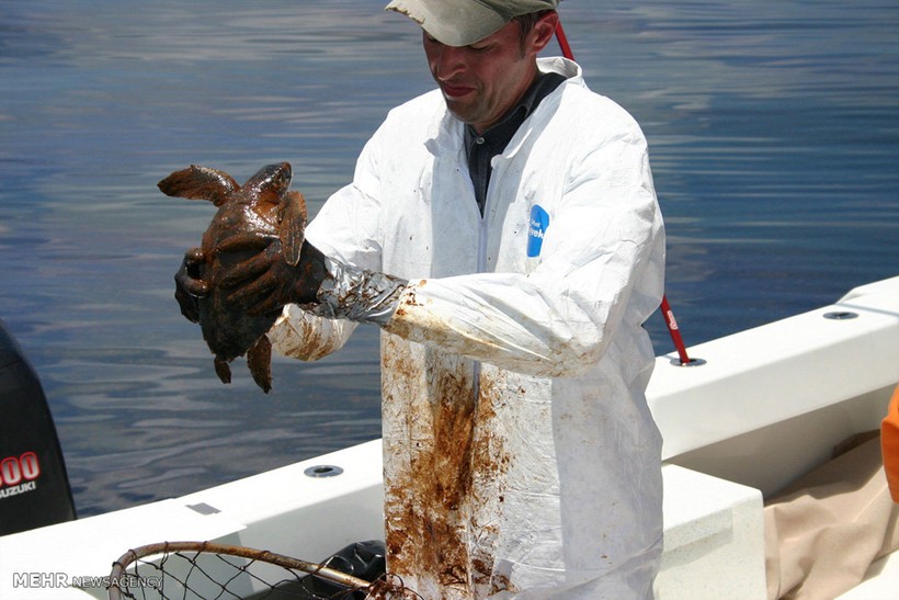 Оливковую черепаху пытаются спасти после разлившейся в море нефти.