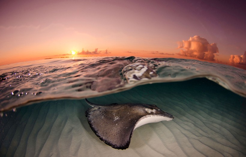 Каймановы острова и скат, проплывающий на рассвете в морских водах.