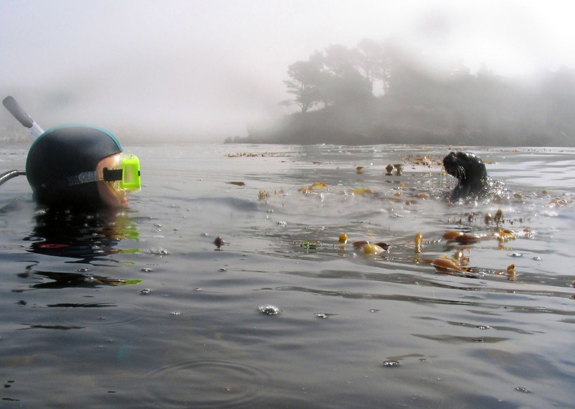 Знакомство выдры и аквалангиста Национального управления океанических и атмосферных исследований.