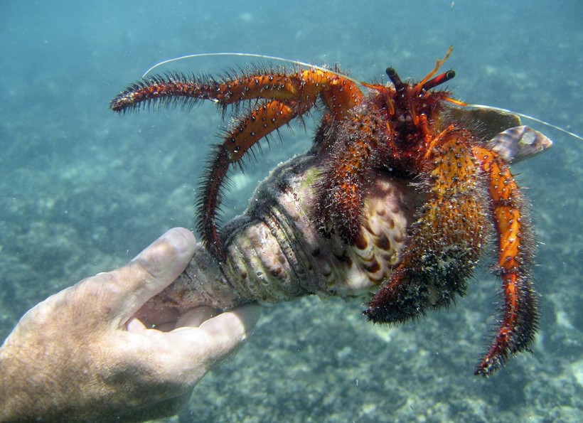 Снимок рака-отшельника, выглядывающего из ракушки.