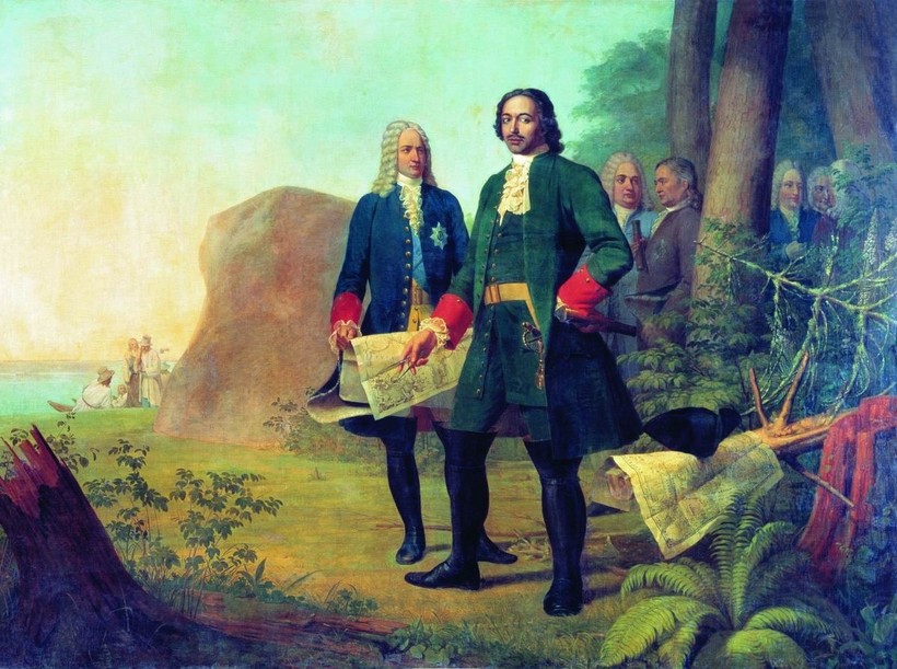Картина была написана Алексеем Венециановым в 1838 году специально для конкурса, победителя которого ожидала крупная денежная сумма. Но масштабное историческое полотно, изображающее императора Петра Первого на месте будущего строительства новой столицы, не получило главного приза и впоследствии отправилось в здание Санкт-Петербургской фондовой биржи.